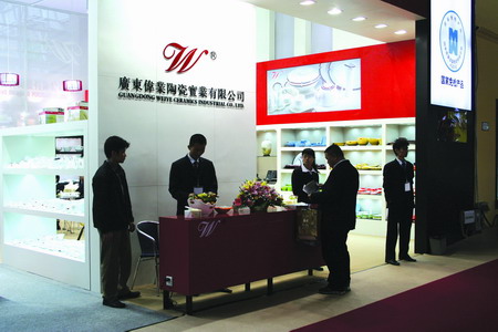 高檔日用強化瓷和高檔骨質(zhì)瓷是廣東偉業(yè)公司的拳頭產(chǎn)品,也是國內(nèi)同類型產(chǎn)品中質(zhì)量最好的產(chǎn)品之一,一直暢銷于海外,公司有多套瓷具曾囊括中國陶瓷產(chǎn)品設計大賽金銀銅獎。在印有清綠蓮蓬圖案的紗帳環(huán)繞下,展廳里那些白如雪、細如絲、明如鏡的楓溪瓷讓人大開眼界,瓷具的色澤光感、款式造型,無不給人以視覺的享受。廳前擺置的茶水糖果,為“偉業(yè)”的親和力加分不少。