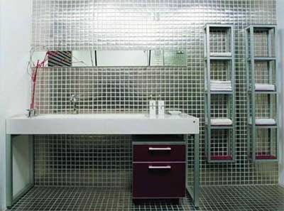 把浴缸沿外延的部分做成了一個臺面,下面一個個方方整整的柜子里,放上泡澡時要用到的一切東東。也別忽視上方的墻上空間,八個小長架會是你得力的收納好助手。