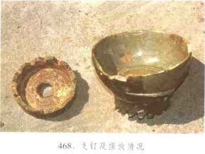 陶瓷器焙燒時(shí)器物與器物之起間隔作用的窯具。多用于疊燒。以耐火粘土制成。常見的形式有兩種;一是用粘土做成泥釘,均勻地粘在器物底面或足面,每件器物少者粘4至6顆、多者9至12顆;二是在墊餅、墊圈和三角形、三叉形間隔具上加3至6顆泥釘,或在其一面直接捏出3至6顆泥釘。支釘出現(xiàn)于三國兩晉南北朝時(shí)期,之后使用越來越多。裝燒時(shí)釘尖接觸釉面,不易粘連。燒成后釉面上往往會留下支釘痕跡。(見圖468)