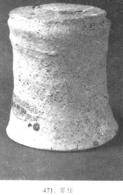 又稱(chēng)“支柱”或“墊柱”,是瓷器焙燒時(shí)支承裝好坯件的匣缽和疊燒坯件的窯具。以耐火粘土制作。呈圓柱形、粗細(xì)、高度不一,下部直徑略大于上部,實(shí)心或中心略空,頗堅(jiān)實(shí),有的表面留下螺旋溝痕,使用方法有二,一是有秩序地排列在窯床上、上面搭鋪一層耐火磚,磚上疊摞匣缽;二是有規(guī)律地?cái)[置在窯床上,每柱上直接承托疊燒的碗等坯件。窯柱在宋元時(shí)期北方地區(qū)使用較為普遍。裝燒用窯柱、可使火焰與煙氣暢流,還可以調(diào)節(jié)窯內(nèi)溫差,有利于瓷器的燒成。(見(jiàn)圖471)