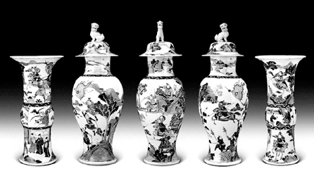 康熙五彩組合陳設(shè)花瓶由將軍罐三件、花觚二件組成。將軍罐體呈直口,長頸,溜肩,鼓腹,斂脛近底處略外撇。淺圓圈足內(nèi)移,無釉澀胎光滑。圓鼓折沿形蓋頗似將軍的帽子,頂塑一蹲踞式雄獅鈕,白釉瑩潤,玉質(zhì)感強(qiáng),獅形活潑,栩栩如生。一只為正面獅形,另二分別是左顧右盼的回首狀獅形。造型輕盈而不失穩(wěn)重,體態(tài)修長而頗具風(fēng)雅;煨头伦陨讨軙r期的青銅觚,觚口外撇呈大喇叭形。古樸端莊而厚實,頗具典雅的儒風(fēng)。