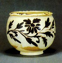 在磁州境內(nèi)(今磁縣觀臺(tái)鎮(zhèn)、彭城鎮(zhèn)一帶),故名。建于宋代,所燒器物純供民間使用,品種繁多,如瓶、罐、盆、碗、缸、甕等,以白地黑花(屬釉下彩裝飾)為主要特征。白地黑花保留了不少民間喜聞樂見的紋飾,如馬戲、孩童釣魚、池塘趕鴨、蹴球等,題材豐富而清新,紋飾線條流暢豪放,黑白色彩對(duì)比強(qiáng)烈,發(fā)展了陶瓷的裝飾藝術(shù),當(dāng)時(shí)深受北方地區(qū)人們喜愛,曾對(duì)南北方不少瓷窯產(chǎn)生很大影響。