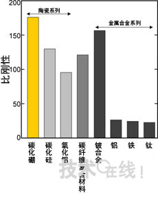 碳化硼在實(shí)用陶瓷中具備硬度高、重量輕的特點(diǎn)。彈性系數(shù)也很高,比剛性(材料比重除以彈性系數(shù)得到的數(shù)值)超過其他的陶瓷、碳纖維復(fù)合材料以及鈹合金(圖3)。由于這些特性,使得碳化硼陶瓷有望成為耐磨損構(gòu)件材料,以及比剛性高的輕量構(gòu)件材料。