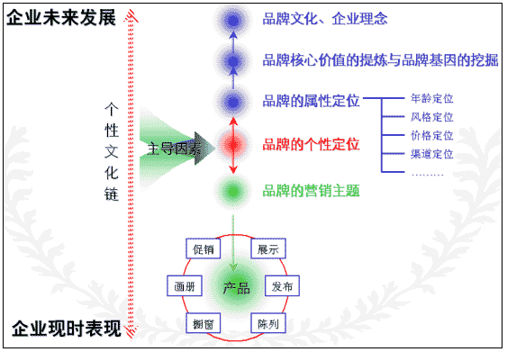 在品牌個(gè)性文化鏈的對(duì)內(nèi)營運(yùn)行為的約束中,其基礎(chǔ)是尋找品牌的基本屬性定位,在不同的品牌產(chǎn)品屬性之中,將自我品牌的產(chǎn)品屬性定位進(jìn)行確認(rèn),包括其應(yīng)包含的品牌年齡定位、風(fēng)格定位、營銷渠道定位、價(jià)格定位等等;繼而再向內(nèi)延伸到品牌核心價(jià)值的提煉與品牌基因的挖掘,使品牌具有更為深層次的識(shí)別內(nèi)容,加深品牌內(nèi)在的識(shí)別體系,進(jìn)而讓品牌具有更加豐富的品位與內(nèi)涵;在此基礎(chǔ)之上,品牌的個(gè)性文化與企業(yè)文化、企業(yè)理念息息相通,是企業(yè)文化與企業(yè)理念在品牌上的獨(dú)立化表現(xiàn),也同樣是凝聚為品牌服務(wù)的各類員工、伙伴、資源體而產(chǎn)生的聚合力。