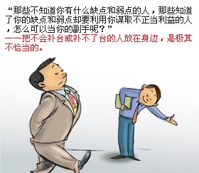 “那些不知道你有什么缺點(diǎn)和弱點(diǎn)的人,那些知道了你的缺點(diǎn)和弱點(diǎn)卻要利用你謀取不正當(dāng)利益的人,怎么可以當(dāng)你的副手呢?”--把不會(huì)補(bǔ)臺(tái)或被不了臺(tái)的人放在身邊,是極其不恰當(dāng)?shù)摹?/p>