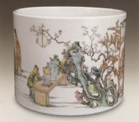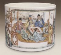 說(shuō) 明: 筆筒通體施透明釉,器身以粉彩勾勒填彩技法,描繪唐代大詩(shī)人李白與友人春夜宴桃李園的情景.