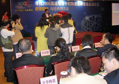 瓷海國際為唱響參與奧運建設(shè)的陶瓷企業(yè)及品牌,連同搜狐、《陶城報》精心策劃舉行的一個時間跨度長、內(nèi)容豐富、與消費者及設(shè)計師互動性強并線上線下進行全方位傳播大型活動——天下陶瓷·共筑奧運“尋找2008奧運場館中的陶瓷品牌”3月26日下午假廣東佛山賓館三樓會議廳新聞發(fā)布會簽約揭牌宣布了正式啟動。到場嘉賓有:搜狐廣州首席代表姚竑彥,佛山人民廣播電臺臺長助理、交通旅游音樂廣播網(wǎng)聯(lián)席運營總監(jiān)謝詩華,中國室內(nèi)設(shè)計研究院佛山聯(lián)絡(luò)處主任湯浩寧,《陶城報》社長劉小明,廣東省裝飾行業(yè)協(xié)會專業(yè)委員會顧問胡小梅和新中源、鷹牌、東鵬等14家參與奧運建設(shè)的陶瓷品牌企業(yè)代表。