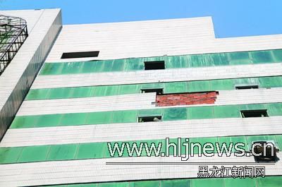 哈爾濱市南崗區(qū)果戈里大街一處樓房,外墻體的墻磚脫落現(xiàn)象很嚴(yán)重。從距地面5米高的地方開(kāi)始,由上到下接連脫落了40余塊墻磚,每塊大約有50厘米長(zhǎng)、25厘米寬。脫落的地方露出水泥墻身,而最上面的幾塊墻磚脫落的地方則直接露出了里面的紅磚。哈爾濱市道里區(qū)地段街一處居民樓的外墻體貼上了一種10厘米長(zhǎng)、5厘米寬紅色的瓷磚,可是破損、脫落情況嚴(yán)重。地段街15號(hào)樓7樓民宅的陽(yáng)臺(tái)外墻體瓷磚脫落百余塊,直接露出了里面的灰白色墻體。