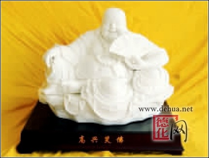 “四美人”分別為貴妃醉酒、西施涴紗、貂蟬拜月、昭君出塞,每尊高35厘米,作者利用“中國(guó)白”傳統(tǒng)瓷雕燒制技藝,做工細(xì)膩精致,造型簡(jiǎn)潔流暢,形體豐滿,高貴柔媚,那薄如紙的瓷質(zhì)衣著,細(xì)如絲的瓷質(zhì)裙帶,把中國(guó)古代四大美女形象表現(xiàn)得淋漓盡致。《高興笑佛》高58厘米,寬40厘米,倚坐山崖之上,雙耳垂肩,笑口大張,左手持扇,右手握珠,一個(gè)坦蕩和善、笑容可掬的彌勒佛像呼之欲出。作者以皓玉瓷為材料,在創(chuàng)作上以簡(jiǎn)馭繁,大氣不拘,傳神地塑造出彌勒的形象,達(dá)到神形的和諧統(tǒng)一。
