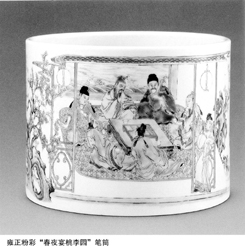 這是一件雍正粉彩“春夜宴桃李園”筆筒,現(xiàn)收藏在上海博物館。筆筒通體彩繪著唐代著名詩人李白與眾詩友“春夜宴桃李園”的故事。
