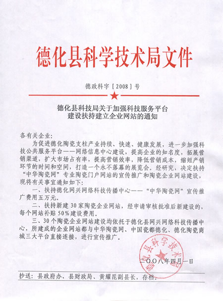 為促進德化陶瓷支柱產(chǎn)業(yè)持續(xù)、快速、健康發(fā)展,進一步加強科技公共服務平臺——網(wǎng)絡信息中心建設,提高企業(yè)的知名度,拓展營銷渠道,擴大市場占有率,提高營銷效率,降低營削成本,縮短產(chǎn)銷環(huán)節(jié)的時間和空間,打造一個永不落幕的展覽會。經(jīng)研究,決定扶持“中華陶瓷網(wǎng)”專業(yè)陶瓷門戶網(wǎng)站的宣傳推廣和陶瓷企業(yè)網(wǎng)站建設,現(xiàn)將有關事宜通知如下: