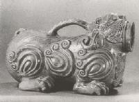 說(shuō) 明: 胎淺灰色,茶綠色釉,施釉勻凈.整個(gè)器體造型生動(dòng).