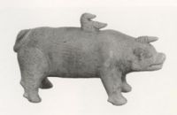 說 明: 胎白色,青釉微黃.狀似牛,體肥壯.