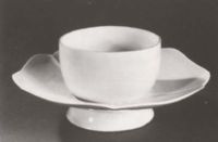 說 明: 胎薄,質(zhì)細白,釉面晶瑩勻凈,微泛黃,芒口毛足.采用釉接法,底書一行書"官"字.造型秀麗.