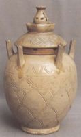 說 明: 胎色微黃,青黃色釉開細(xì)冰裂紋.花紋裝飾簡(jiǎn)潔樸素,造型穩(wěn)重,是越窯晚期不可多得的制品.