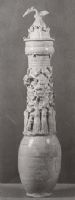 說 明: 全器施青白釉,蓋內(nèi)器內(nèi)與器底均無釉.這類堆塑瓶在江西宋、元墓隨葬品中頗為流行,應(yīng)與當(dāng)?shù)鼐用褡诮绦叛鲇嘘P(guān).