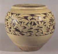 說(shuō) 明: 胎質(zhì)白而微黃,敷化妝土,上施白釉,釉不到底.腹上部刻劃纏枝牡丹并填黑彩作地.遼瓷的器型裝飾明顯地反映了契丹族的民族風(fēng)格.