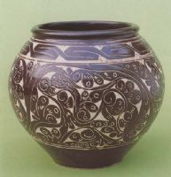 說(shuō) 明: 在剔出的米黃色的胎地上烘托黑褐色釉的花紋,色調(diào)和諧,紋飾粗放,是雁北地區(qū)剔花裝飾的代表作品.