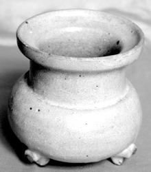 此尊盤形口宋代民汝窯爐,于燒制汝官瓷的所在地寶豐縣清涼寺出土。它高9厘米,爐口直徑8厘米,束頸,扁鼓腹,下附三獸形短足;爐底中心形成自然凹陷,一厘米見方。胎體厚重,胎骨堅(jiān)硬,除了內(nèi)壁底部有些露胎外,其余均為滿釉;施釉肥厚、瑩潤、飽滿;釉彩呈香灰色,土氣較重,留下了明顯的被泥土侵蝕的痕跡。整個(gè)香爐造型古樸,氣韻典雅。在汝窯遺址實(shí)地考察時(shí),我見過不少民汝、官汝出土遺物,此尊盤形口香爐的釉色離官汝還有一定的差距,為民汝窯。但就是民汝香爐如此完整的也頗少見,具有很高的收藏價(jià)值。