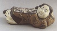 說 明: 瓷胎細(xì)膩堅(jiān)硬,白釉彩繪.整體為一臥女形象,其神態(tài)自然悠閑,造型優(yōu)美大方.色調(diào)對比鮮明,具有濃郁的民間氣息.