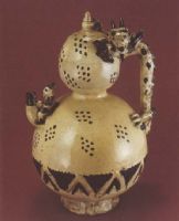 說(shuō) 明: 淡黃色胎.掛牙白釉,釉層較厚,足根露胎.此注壺頂無(wú)口,而在圈足內(nèi)挖一圓注水孔,與通入壺內(nèi)的注水管相連,裝水時(shí)將壺倒置.可謂構(gòu)思奇特,獨(dú)具匠心.