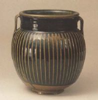 說 明: 胎質(zhì)堅硬,呈灰白色.黑釉明亮,內(nèi)有藍(lán)色牛毛紋.白線紋裝飾富有地方特點,為山東、河南一些地方瓷窯所產(chǎn).