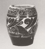 說(shuō) 明: 橙黃色粗胎,內(nèi)壁施黑釉,外壁施醬釉,剔花圖案.可能為釀造器皿.