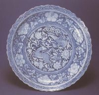 說 明: 器身施青白釉,底素胎無釉.全器構圖嚴緊,巧妙的處理青花設色,形成藍地白花紋飾,更增添其藝術效果.