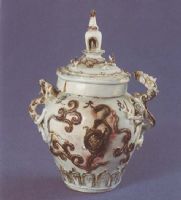 說(shuō) 明: 胎質(zhì)細(xì)膩,青白釉.堆塑飾以釉里紅點(diǎn)綴,造型生動(dòng),形象逼真.全器造型奇特,工藝精巧.