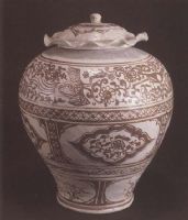 說 明: 胎灰而堅,白地褐花.構(gòu)圖嚴(yán)謹(jǐn),變化中求統(tǒng)一,互相呼應(yīng),主次分明.雙鳳四喜鵲紋飾較為少見,是當(dāng)時匠師的創(chuàng)新之作.和吉州窯的產(chǎn)品很相似.