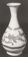 說 明: 灰白色胎骨,堅硬厚重,有明顯的旋痕.釉色青白瑩潤.釉里紅呈淡雅的暗紅色,有暈散現(xiàn)象.但仍不失為元代少見的藝術珍品.