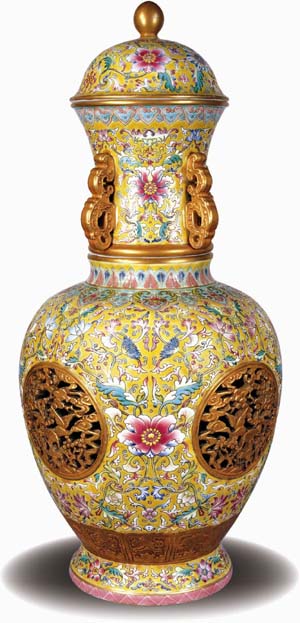 本次拍賣會主打拍品為乾隆黃地粉彩描金鏤雕開光纏枝番蓮紋轉(zhuǎn)心瓶。此瓶為宮廷陳設器,是清代乾隆年間宮廷內(nèi)流行的瓶式之一。此瓶造型風格莊重高雅,精美大氣,胎體細膩堅致,線條流暢,鏤雕工藝設計精巧,刀法精湛嫻熟,畫面璀璨華麗,透出盛世華貴之氣,是一件難得的清乾隆宮廷藝術珍品。