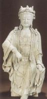 說 明: 胎質(zhì)細膩,釉色瑩潤明亮.素雅的淡青色和精致堆塑的華麗裝飾,組成了和諧的整體,給人以華美綺麗之感.塑像采用局部分塑組裝一次燒成,顯示出元代制瓷工藝的高水平,是元代瓷造像中罕見的藝術(shù)珍品.