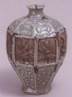 說(shuō) 明: 通體呈八棱形.肩與腹下部施青釉,腹中部澀胎無(wú)釉.器身青釉點(diǎn)褐彩,是元代龍泉窯典型的施彩方法.