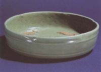 說 明: 青色釉.內(nèi)刻一朵盛開的蓮花,其外印貼四條火石紅色魚紋.火石紅色是未上釉的坯胎入窯焙燒時(shí)被氧化而成,用于此處更突出了魚紋的藝術(shù)效果.
