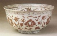 說 明: 胎質精細,色潔白.釉色白中閃青,施釉較厚.紋飾線條流暢,圖案清晰,呈色艷麗.燒制釉里紅器火候不易控制,呈色多不穩(wěn)定,而此碗為釉里紅器中成功之作.