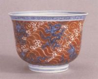 說 明: 此器采用釉下青花與礬紅兩色描繪九龍鬧海紋飾,表現(xiàn)了制瓷匠師們?cè)跇?gòu)圖及用色方面的高超技藝.