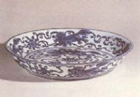 說 明: 盤形制較大,制作規(guī)整.胎質(zhì)細(xì)潤(rùn),釉質(zhì)晶瑩肥厚.獅子體態(tài)靈活輕盈,形象自然生動(dòng),構(gòu)圖布局合理.青花色澤濃艷,濃艷處基本無鐵銹斑點(diǎn),這在同期的青花器中較為少見.