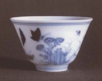 說 明: 杯底青花雙方欄楷書"大明成化年制"款.胎薄體輕,紋飾細膩,施彩淡雅,輕盈秀麗,制作工藝極為精致,是成化彩瓷中的精品.