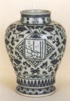 說 明: 胎質(zhì)厚重,釉色白中閃青.圖案布局嚴(yán)謹(jǐn),紋飾清晰.青花灰中泛紫,濃處有鈷鐵斑.造型與紋飾均是正德時(shí)期的典型藝術(shù)風(fēng)格.