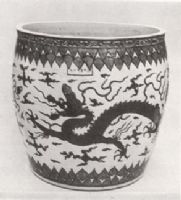 說 明: 造型雄渾,繪圖精美.大型的青花缸,又稱龍缸,在景德鎮(zhèn)專設有龍缸窯燒造.此缸出土時內貯有油脂,內放銅油漂和燈芯,此油缸即所謂的"長明燈".