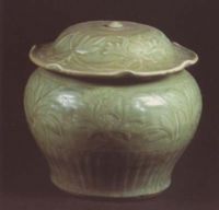 說 明: 紋飾劃刻生動,枝葉纏繞,蓮花盛開.器身施滿青綠色釉.胎體厚重.
