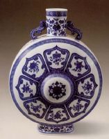 說(shuō) 明: 瓶因圓腹當(dāng)中凸出一圓月而得名.清雍正早期曾燒制,至乾隆時(shí)重又燒制.此瓶用青花故意點(diǎn)染深淺不同的細(xì)點(diǎn),是仿明宣德青花呈色的效果.