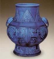 說(shuō) 明: 此器造型和圖案均模仿古銅器,在孔雀綠釉的襯托下,頗顯古樸凝重.