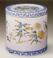 說 明: 此罐身米黃色地上繪折枝竹、菊紋,色彩淡雅.