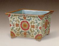 說 明: 該花盆胎體較輕薄,通體施湖綠彩,內(nèi)壁半釉,粉彩繪畫.因戰(zhàn)亂一度停燒,清咸豐朝后期官窯器物較少,且前期官窯器質(zhì)量較精,故咸豐官窯器比較精貴.此件造型工整,色彩華麗,更無愧為精品之稱.
