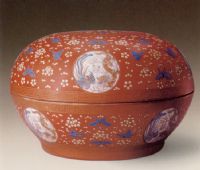 圖片名稱: 紅地粉彩花蝶開光龍鳳紋蓋盒