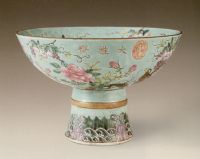 說 明: 此高足碗為供器,胎體堅(jiān)致,是慈禧太后的御用瓷."天地一家春"是圓明園內(nèi)的一組建筑群,慈禧于此處得寵于咸豐皇帝,故她一直念念不忘此處.