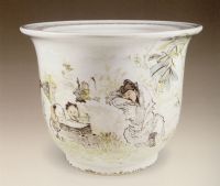 說 明: 水墨五彩是清光緒朝的新品種,作品不多見.瓷畫仿黃慎之筆,作者應(yīng)為不見經(jīng)傳的畫家.此盆為官窯器.