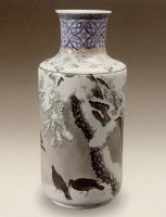 說 明: 此瓶頸部繪青花釉里紅,器腹畫黑彩松、雪、鳥.青花釉里紅色澤濃艷鮮亮,墨彩有深淺之分.此種裝飾,甚為珍稀.